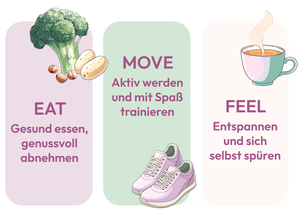 Mit den drei Säulen EAT, MOVE und FEEL vereinst du gesunde Ernährung, Bewegung und Entspannung, um dein Wohlfühlgewicht zu erreichen und dauerhaft zu halten. Klar, einfach, alltagstauglich – und ganz ohne Druck!